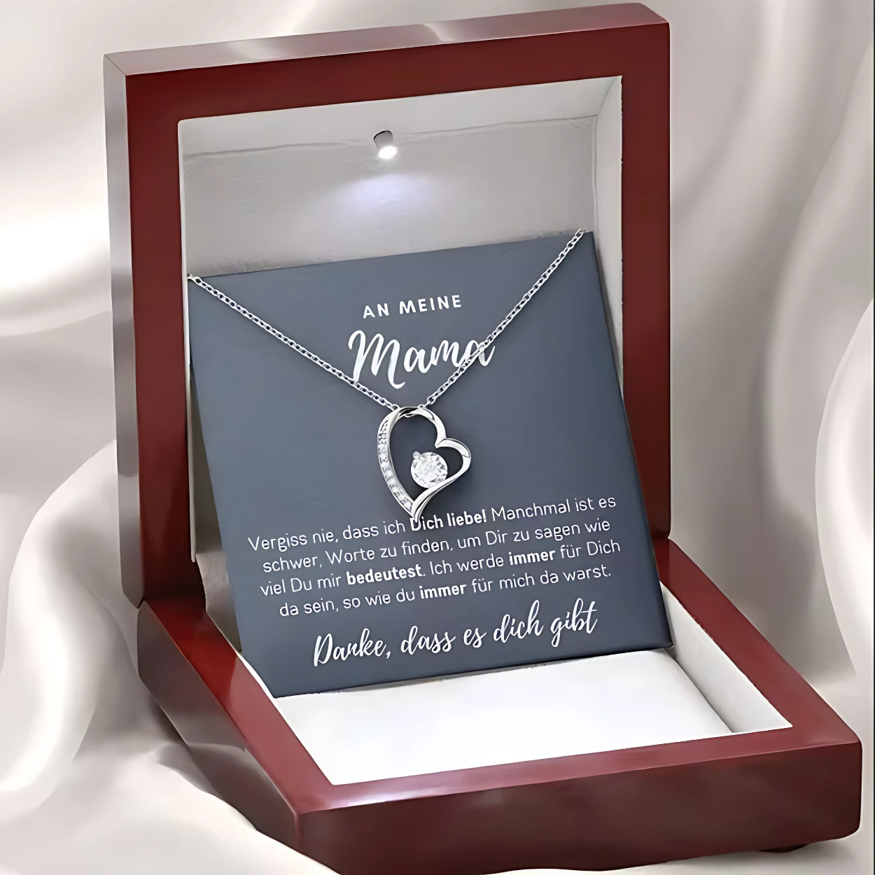 Überrasche deine Mutter mit einer eleganten Kette, stilvoll präsentiert in einer edlen Holzbox mit sanftem LED-Licht, das ihre Schönheit unterstreicht. Begleitet von einer liebevollen Botschaft auf einer hochwertigen Karte – ein Symbol für Liebe, Dankbarkeit und eure besondere Bindung.