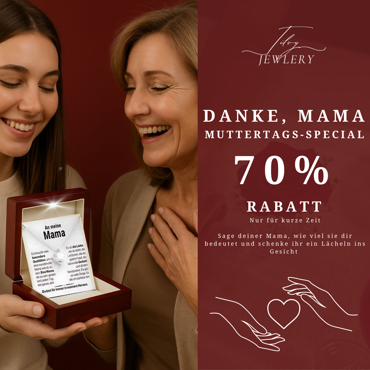Unsere Kette ist nicht nur ein Schmuckstück – sie ist ein Symbol für Liebe und Dankbarkeit. Geliefert in einer eleganten Holzbox mit LED-Licht, wird sie wunderschön in Szene gesetzt. Dazu eine liebevolle Botschaft auf einer hochwertigen Karte, die Mama zeigt, wie sehr du sie schätzt. Dieses Geschenk ist emotional, edel und einzigartig – perfekt, um Mama an Weihnachten sprachlos zu machen.